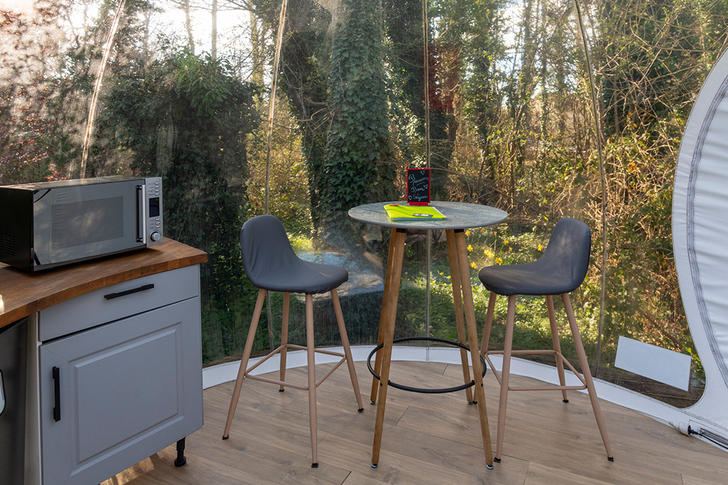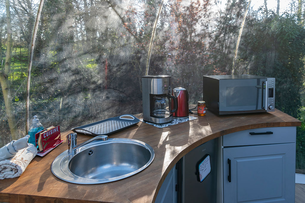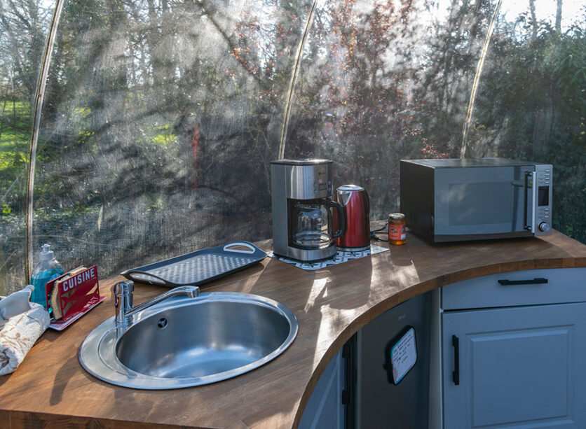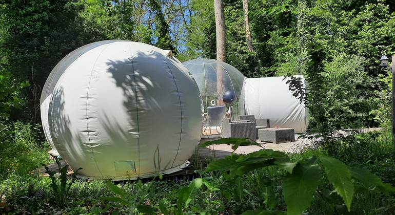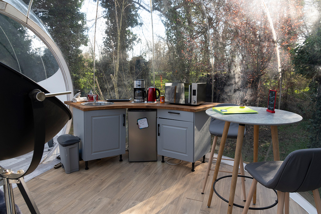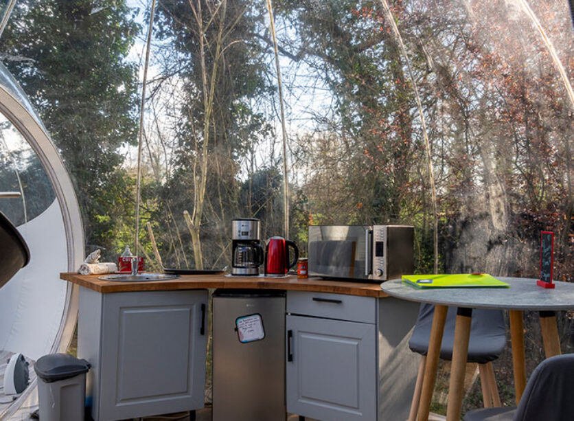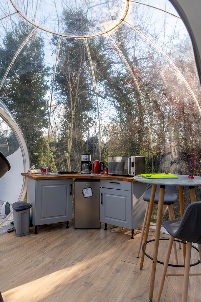 Notre Maison Bulle comme son nom l'indique est composé de 3 dômes, dans le 1er dôme se trouve une petite cuisine aménagée (frigo, micro ondes, cafetière, bouilloire) pas de plaques de cuisson pour la sécurité de la bulle, dans le 2éme dôme le coin chambre et dans le 3éme dôme la petite salle de bain. L'entrée de la Bulle est un SAS de décompression, IL EST TRÈS IMPORTANT DE FERMER LA 1 ÈRE PORTE AVANT D'OUVRIR LA 2 ÈME (sinon la maison bulle se dégonfle) Il est donc très important que votre accueil se fasse avec nous !
