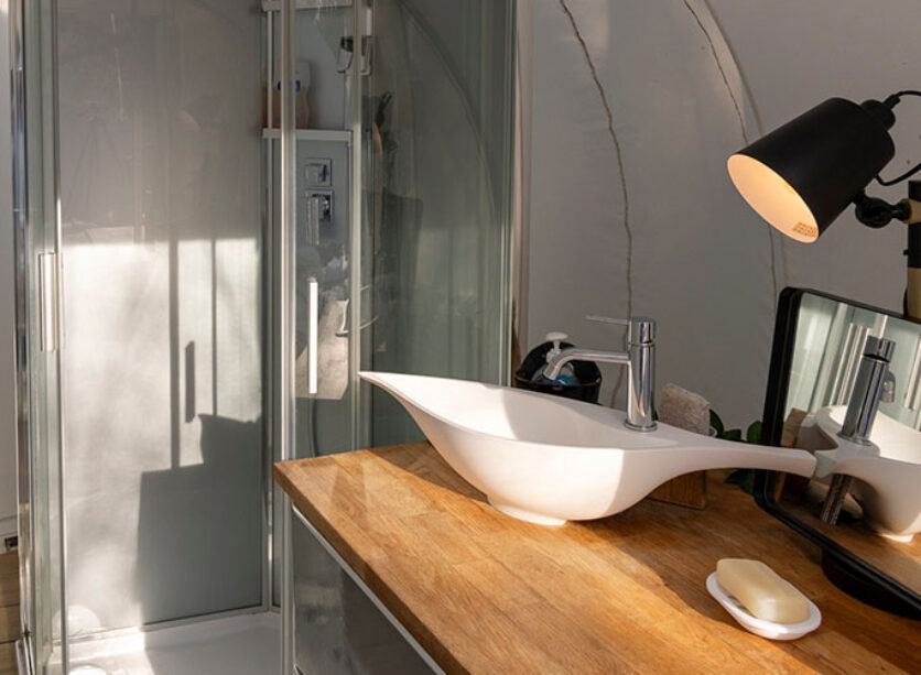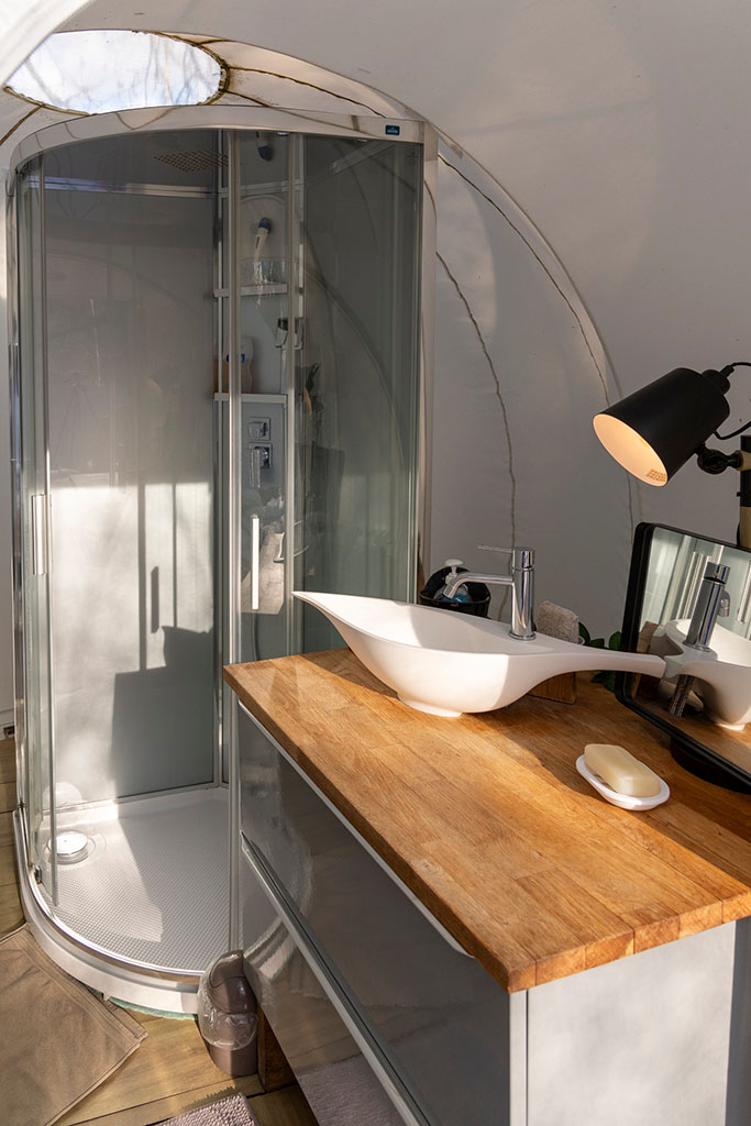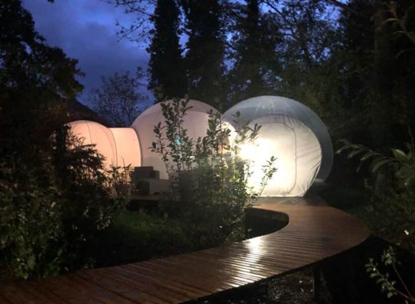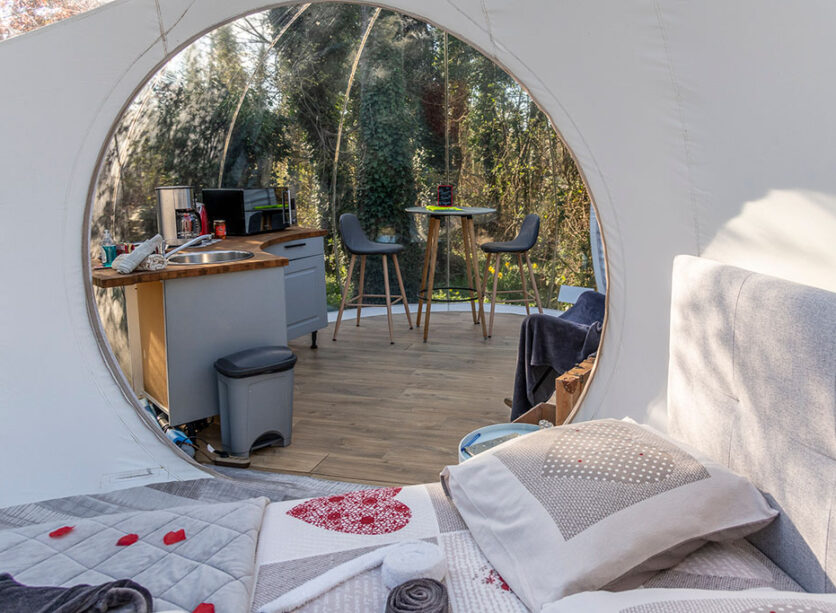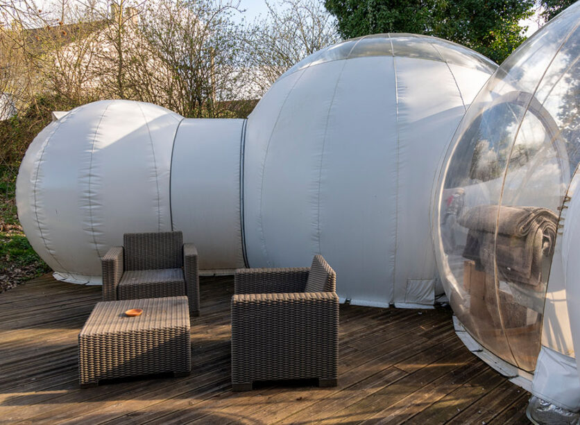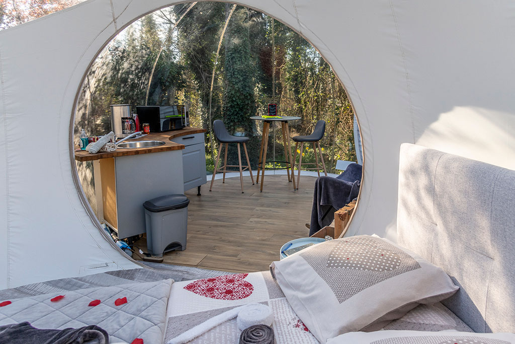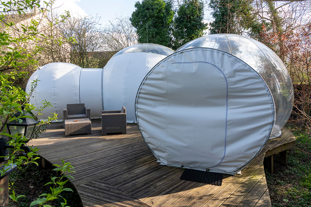 Notre Maison Bulle comme son nom l'indique est composé de 3 dômes, dans le 1er dôme se trouve une petite cuisine aménagée (frigo, micro ondes, cafetière, bouilloire) pas de plaques de cuisson pour la sécurité de la bulle, dans le 2éme dôme le coin chambre et dans le 3éme dôme la petite salle de bain. L'entrée de la Bulle est un SAS de décompression, IL EST TRÈS IMPORTANT DE FERMER LA 1 ÈRE PORTE AVANT D'OUVRIR LA 2 ÈME (sinon la maison bulle se dégonfle) Il est donc très important que votre accueil se fasse avec nous !